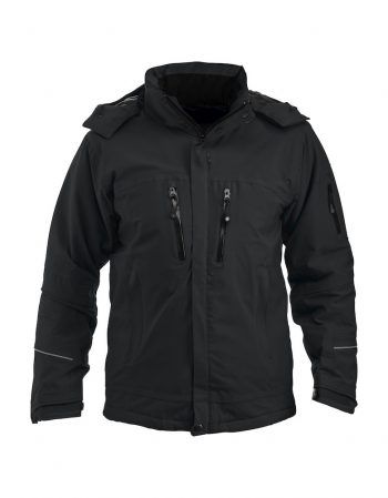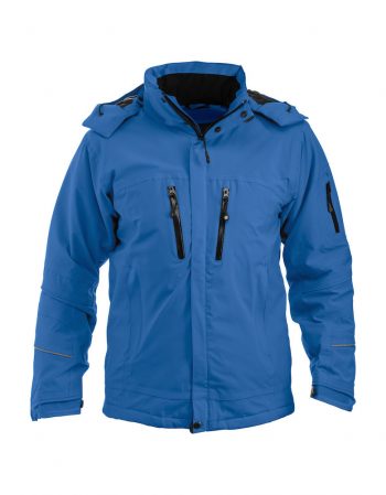 Vadderad vinterjacka. Vind och vattentätt material med andas funktion, vattentäta blixtlås fram och i sidfickor. Reglerbart ärmavslut med tryckknappar. Innerfickor. Justerbar huva med elastiska snören.