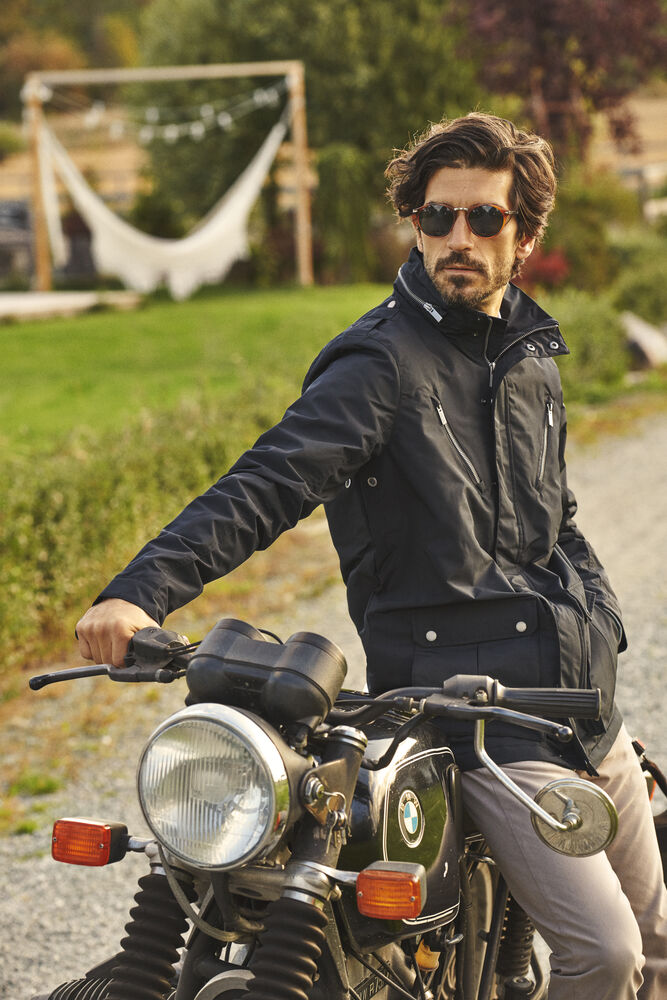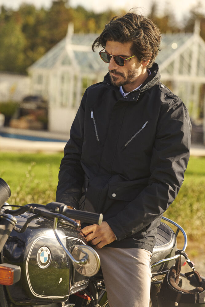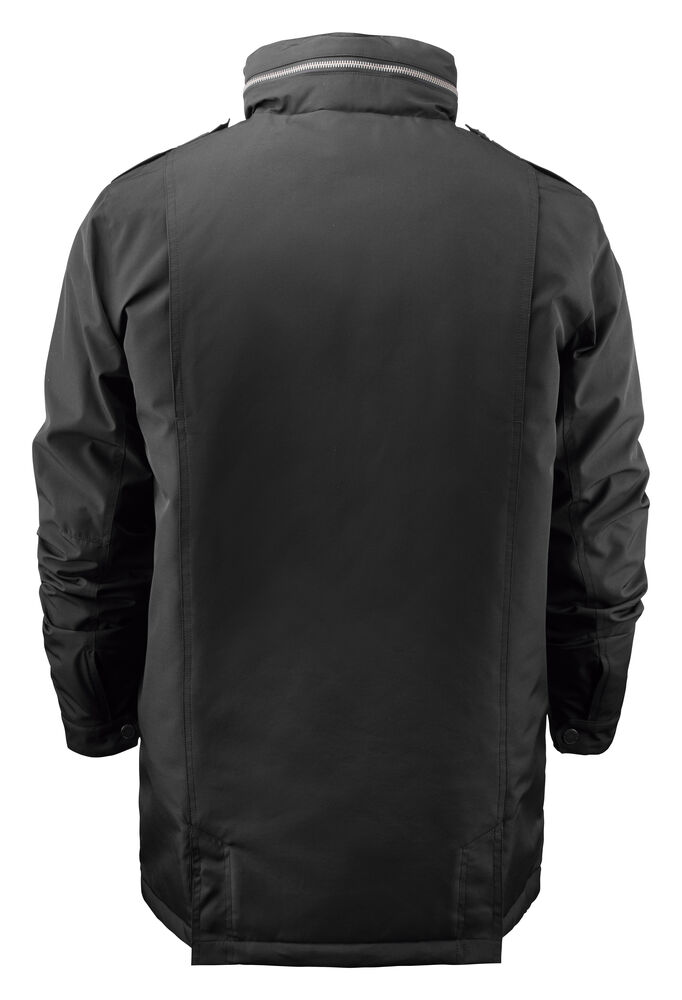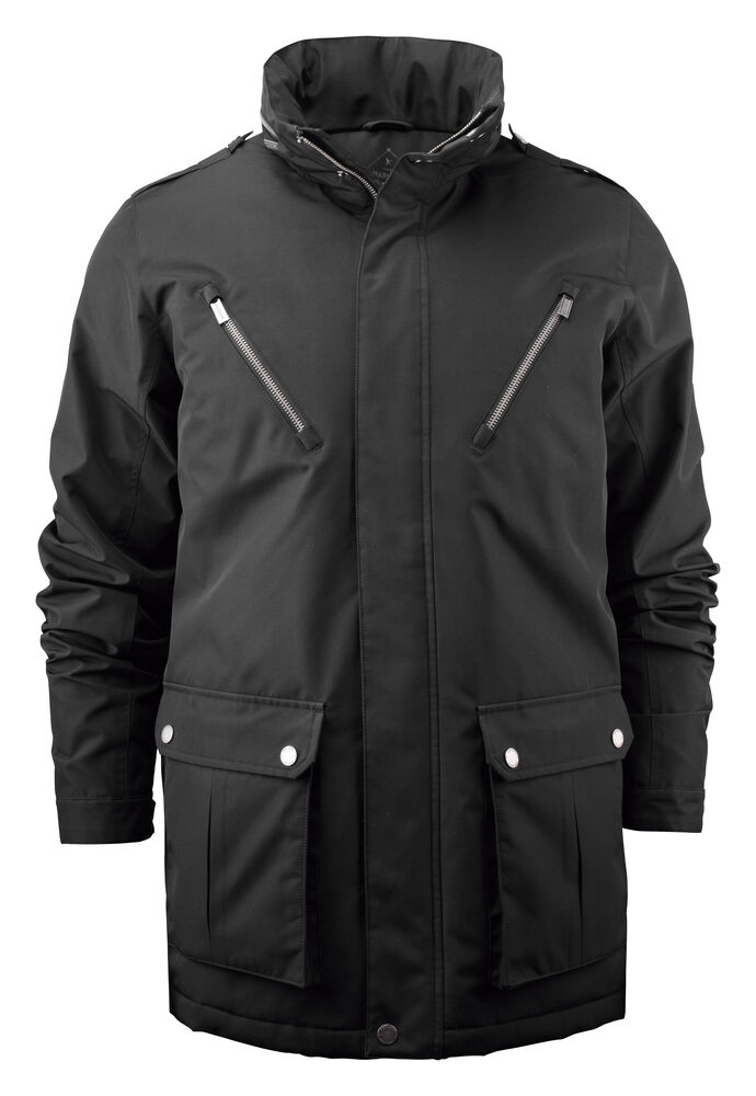Herrjacka i kavajlängd. Lätt vadderad med quiltat foder. Två utanpåliggande bälgfickor framtill och två snedställda bröstfickor med synligt blixtlås. Stilrena detaljer som axelklaffar och dold huva i kragen.