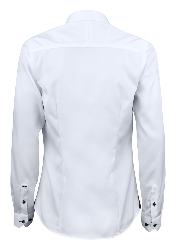 Klasisk damskjorta med sofistikerade detaljer. Rutigt foder i kontrasterande färg på insida av krage samt manschett. Även knapphål i kontrasterande färg. Högkvalitativ tät twill med glans som gör den mindre genomskinlig. Delat ok för ökad rörlighet, kort krage. Tejpade sömmar samt skrynkelfribehandling.